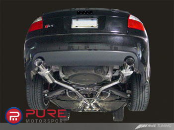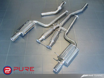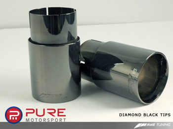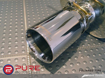 The AWE Tuning exhaust makes the stock system look puny in every way. AWE's straight through resonators and mufflers ensure flow while keeping the noise level down to civilized volume. There is very minimal drone with this system. AWE's signature 3.5" beveled exhaust tips sport laser etched AWE Tuning logos and are double walled to ensure a mirror polish even under hard usage. Both tips are individually adjustable to provide for perfect fitment even with European and aftermarket bumpers.