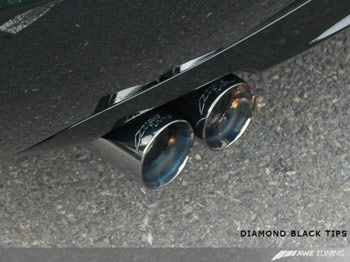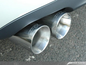 The AWE Tuning exhaust makes the stock system look puny in every way. AWE's straight through resonators and mufflers ensure flow while keeping the noise level down to civilized volume. There is very minimal drone with this system. AWE's signature 3.5" beveled exhaust tips sport laser etched AWE Tuning logos and are double walled to ensure a mirror polish even under hard usage. Both tips are individually adjustable to provide for perfect fitment even with European and aftermarket bumpers.