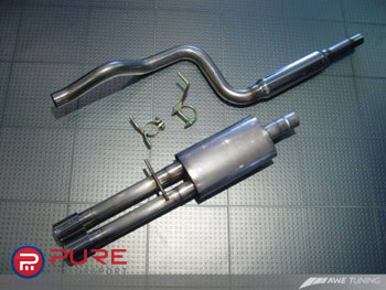 The rear muffler is a single 2.50" inlet, dual 2.25" outlet design, with full T304 stainless steel construction including the packing material. Our signature 3.15" beveled exhaust tips sport laser etched AWE Tuning logos and are double walled to ensure a mirror polish even under hard usage. These are the best looking tips on the market.