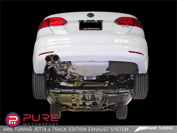 The more vocal of the family, the AWE Tuning Mk6 Jetta 2.5L Track Edition Exhaust does not have the Helmholtz resonators, and as such, has a more raw, aggressive tone.