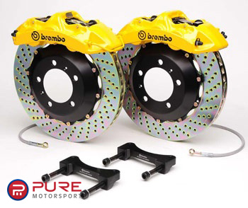 The Gran Turismo system's level of technology and performance is unrivaled by any other product on the market. Each system is designed vehicle specific for maximum performance and Optimum Brake Balance. Gran Turismo Systems are comprised of lightweight 4, 6 or 8 piston calipers and 1 piece or 2 piece floating vented rotors up to 15 in diameter. Calipers are available in red, silver or black and discs are available in cross drilled or slotted. Increased brake torque and thermal capacity, dramatically improves the vehicles performance.